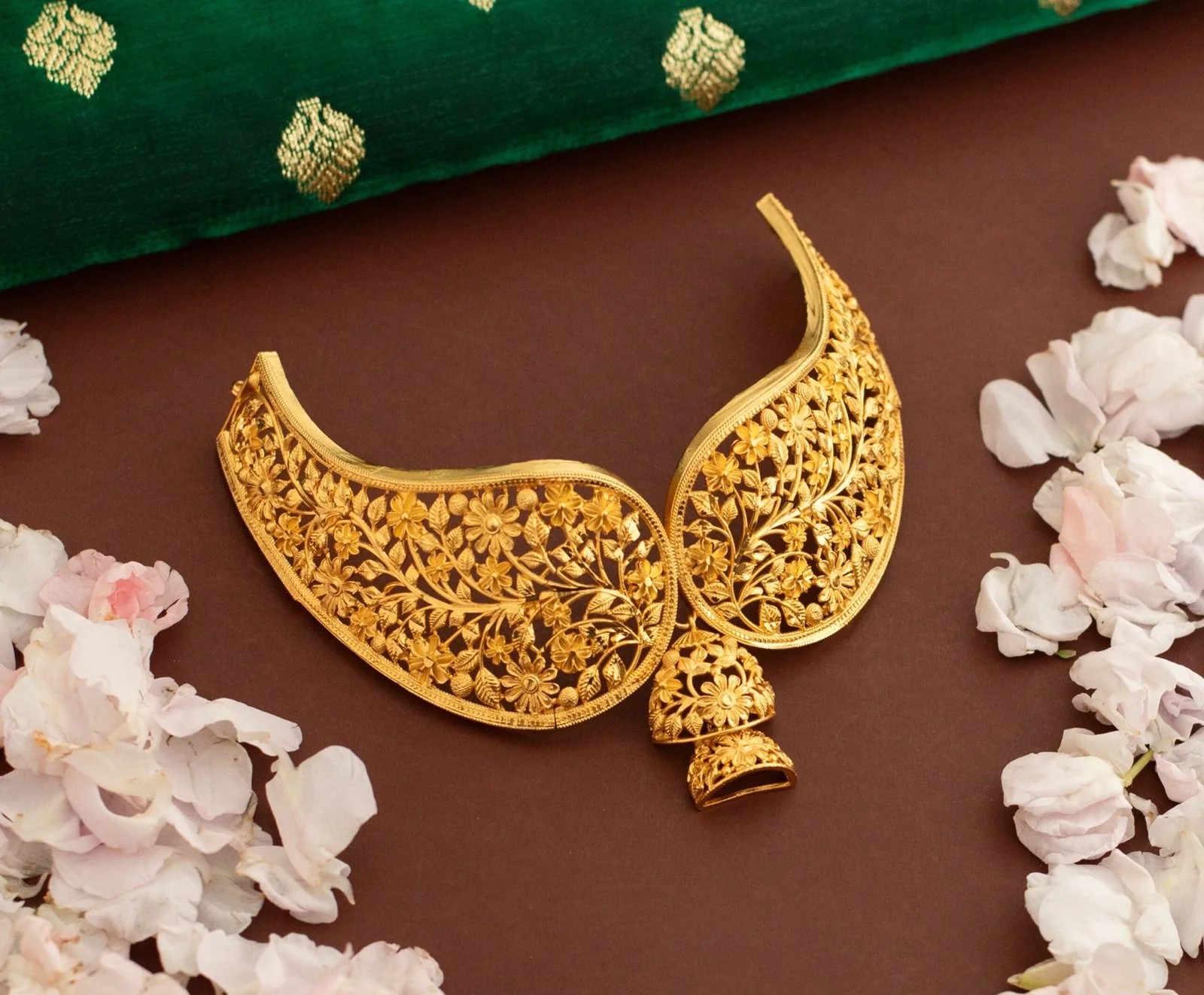 Elegant gold-plated floral filigree collar necklace with intricate detailing and antique finish—perfect for bridal and festive wear.