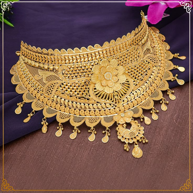 Make a bold royal statement with this exquisitely crafted gold plated bridal choker necklace, designed with intricate detailing and a luxurious finish. This masterpiece features a beautifully layered structure combining mesh texture, floral motifs, and traditional patterns, giving it a rich and elegant appeal.