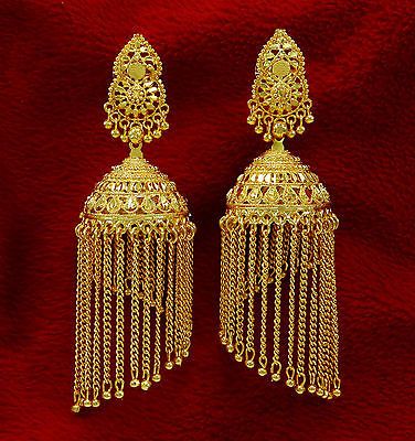 The product in the image is a pair of  gold-plated Jhumka earrings, a traditional South Asian design popular for weddings and festive wear. These earrings feature a large floral stud top leading to three cascading bell-shaped layers, providing a majestic and elongated silhouette.