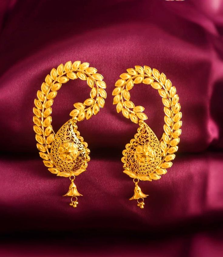a pair of Gold Fullkaan earrings, a traditional heritage design particularly prominent in Bengali culture. These ornate pieces are characterized by a curved, ear-hugging structure often inspired by natural forms like the mango leaf.