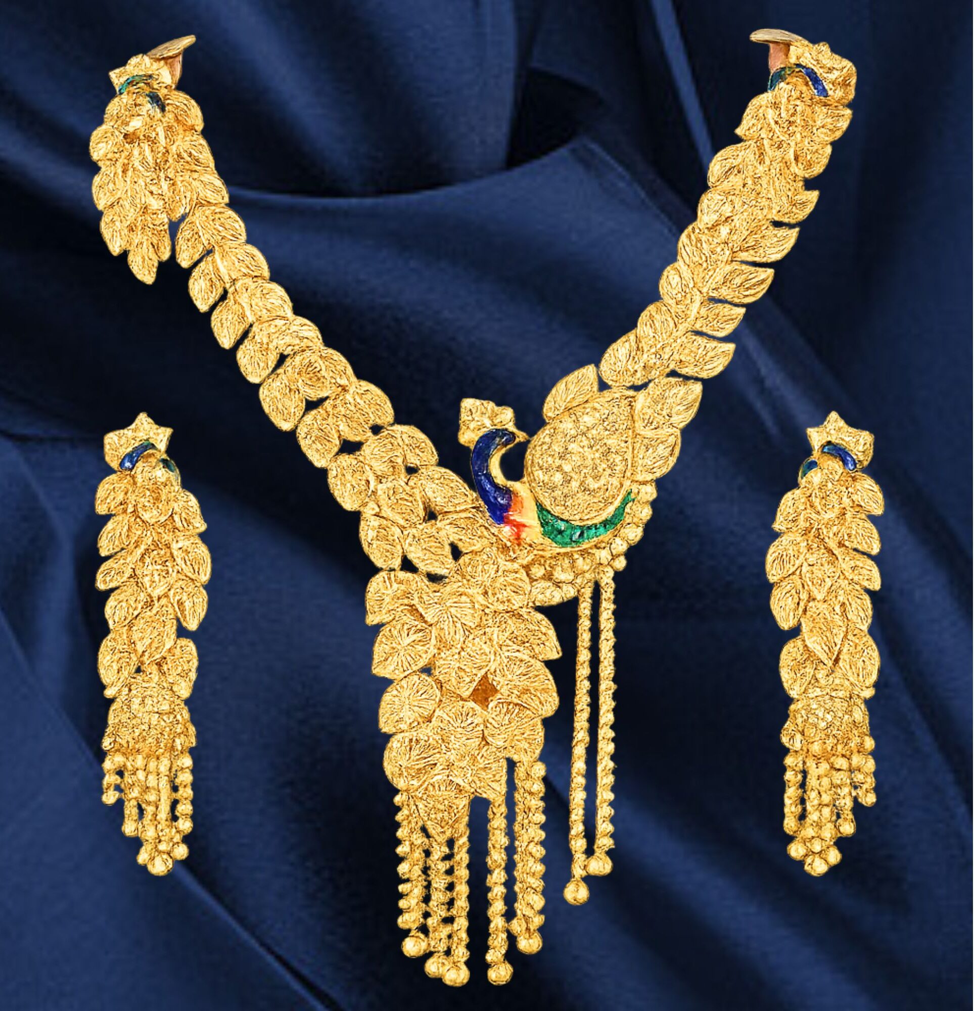Paired with matching earrings, this set is perfect for weddings, festivals, and special occasions. The lightweight yet premium finish ensures both comfort and elegance, making it ideal for long wear.