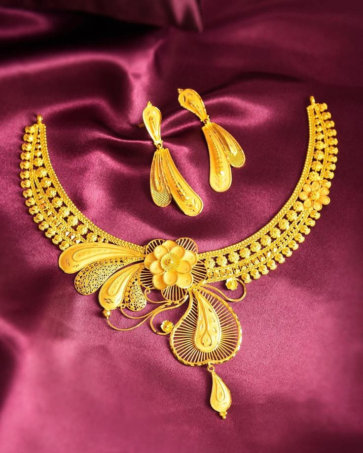 - Intricate Floral Artistry:Â The necklace’s centerpiece features a blooming floral motif, surrounded by delicate filigree work and a polished “sitaharr” finish.